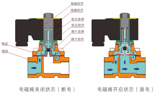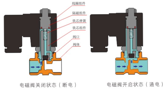 原理:福州承泽影视制作有限公司直动式电磁阀分常闭型和常开型两种。常闭型电磁阀断电时为关闭状态,线圈通电时产生电磁力,动铁芯跟静铁芯吸合,电磁阀阀口打开,介质(流体)通过;当电磁阀线圈断电时电磁阀消失,在弹簧的作用力下,电磁阀动铁芯复位,阀口关闭,介质(流体)不同,电磁阀呈关闭状态。常开型与之相反。